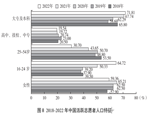 志愿者仍以受过高等教育的中青年女性为主,并且呈现年轻化、高知化、价值导向、学习导向、志愿者动员的行政化与志愿服务的非组织化并存等特征。