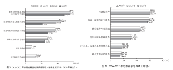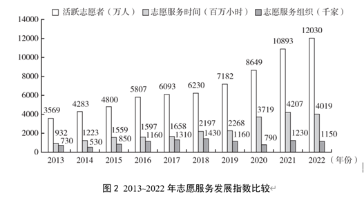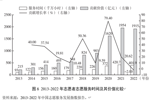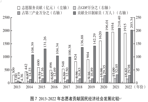 志愿者贡献价值达到1915亿元,占GDP15.82‱,较2013年增长3.39倍;占第三产业总产值8.19‱,较2013年增长了2.66倍;为社会无偿提供203.34万全日制雇员,占社会组织从业人员的18.48%,较2013年增长了3.66倍。
