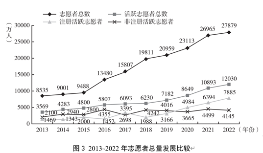 志愿者2.79亿人,比2021年增加914万人,增长了3.39%。其中,活跃志愿者1.20亿人,占志愿者总数的43.01%。