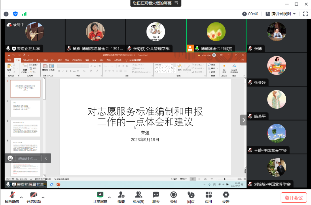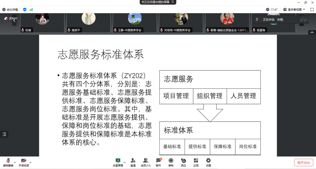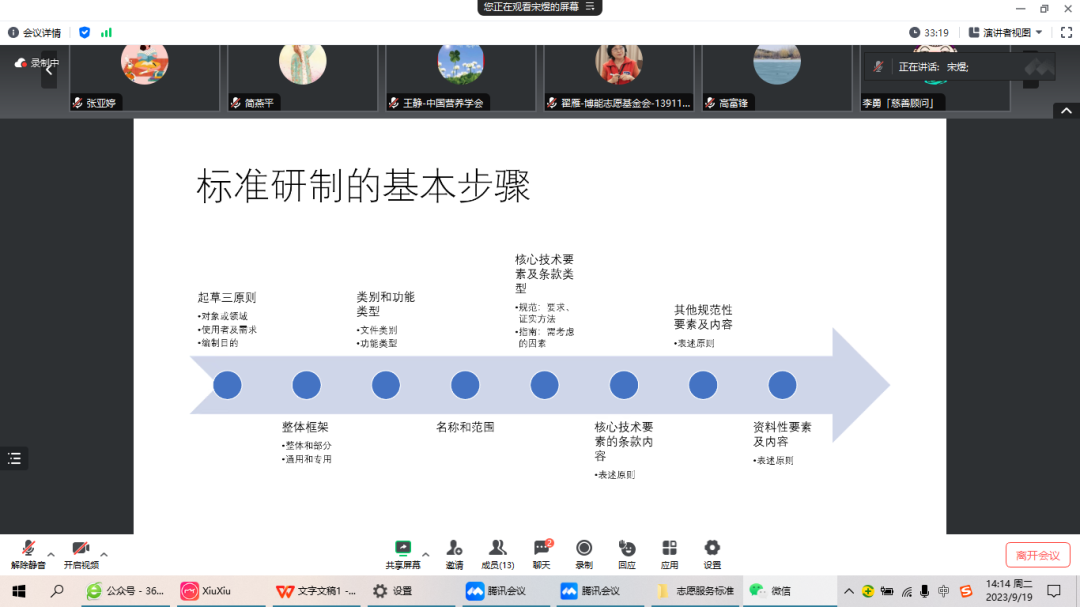宋煜老师结合项目组在标准调研、编制、立项、评审等全流程工作的经验基础上,结合在研的行业标准《志愿者招募和培训工作指南》,手把手指导大家如何开展标准研发工作。