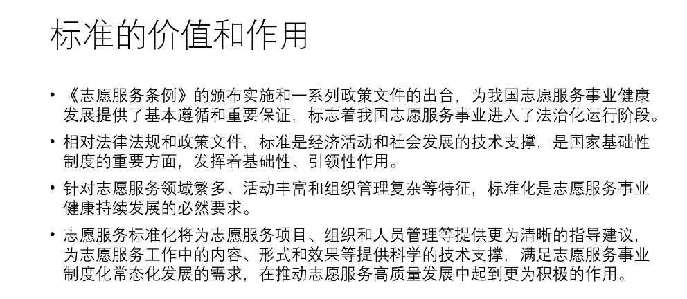 作为志愿服务标准研发人员,首先需要掌握该领域的 通识,标准的价值和作用、标准的类别和不同管理办法、国际志愿服务标准与国内志愿服务标准之间的差异、标准体系的结构和相互关系等等。