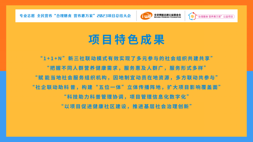 “1+1+N”新三社联动模式有效实现了多元参与的社会组织共建共享、“把握不同人群营养健康需求,服务惠及人群广,服务形式多样”、“赋能当地社会服务组织机构,因地制宜动员在地资源,多方联动共参与”、“社企联动助科普,构建“五位一体”立体传播阵地,扩大项目影响覆盖面”、“科技助力科普管理协调,项目管理信息化数字化”、“以项目促进健康社区建设,推进基层社会治理创新”。