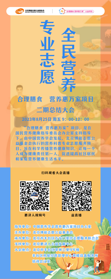 “合理膳食,营养惠万家”营养科普专业志愿服务项目(简称“项目”)二期总结大会将于2023年8月25日在北京市丰台区翠林三里9号楼举行。本次大会旨在回顾与总结项目二期中所取得的成果,同时也希望更好推进项目汇聚各界力量,共同推动营养健康领域的发展和进步。