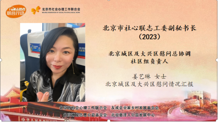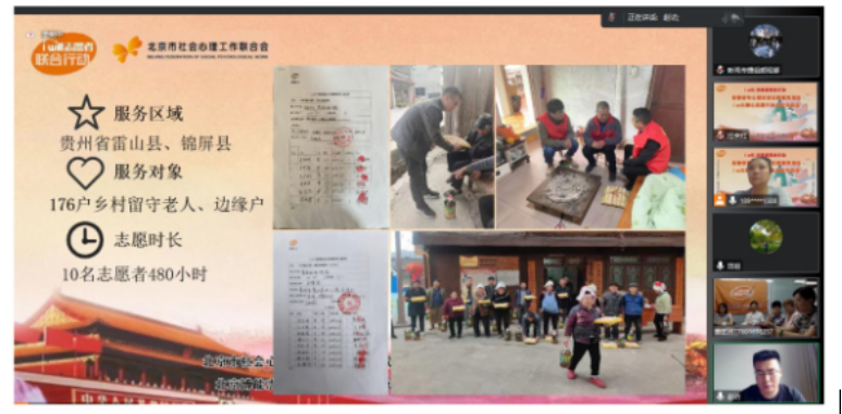 北京城区及大兴区社区慰问组负责人、北京市社心联志工委副秘书长姜艺琳对北京地区的慰问整体情况做了详细介绍。北京城区及大兴区在二期暖心行动中覆盖东城区、海淀区、丰台区、朝阳区、大兴区五个城区进行了入户慰问,对接社区53个,走进了298个逝者家庭,组织党员志愿者、老年志愿者、大学生志愿者、中学生志愿者、青少年志愿者参与其中,积极参与到一线慰问中,其中,年龄最长志愿者73岁。志愿者们充分发挥志愿精神服务在一线,优秀志愿者杨秀清、马功臣、宋革军、宋礼、李燕、刘姝君等默默奉献,慰问多个社区超过10户家庭,提供了专业志愿服务。