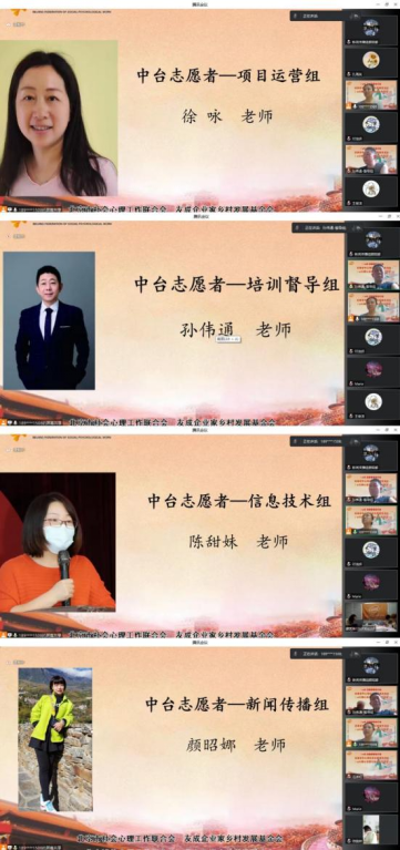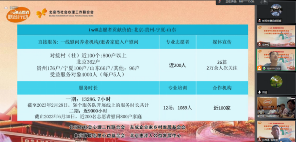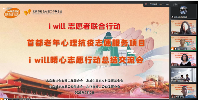 2023年7月2日下午13:30,首都老年心理抗疫志愿行动暨i will暖心志愿行动线上总结交流会如期而至。北京市社会心理工作联合会会长张青之、北京市社会心理服务促进中心副主任/北京市社会心理工作联合会副会长张胸宽、北京博能志愿公益基金会理事长/北京市社会心理工作联合会副会长翟雁、北京市社会心理工作联合会秘书长丁岩、友成企业家乡村发展基金会秘书长零慧、北京博能志愿公益基金会项目总监李静、北京市社心联志工委秘书长安茹、副秘书长李丹、姜艺琳,以及参加本次志愿行动的i will优秀志愿者代表共40余人出席会议。总结会由北京市社心联志工委副秘书长、志愿行动项目经理李丹主持。