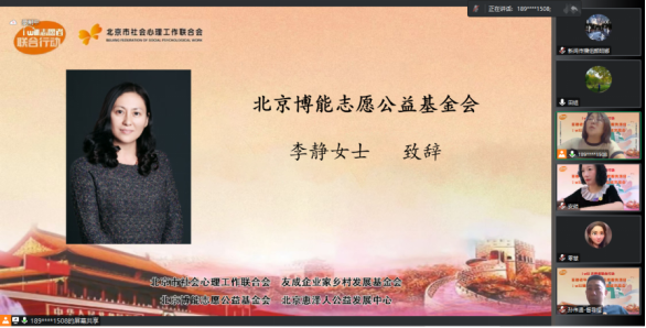 北京博能志愿公益基金会代表、项目总监李静致辞。她表示,今天是本次志愿行动的总结,也是另一个行动的开始。在这次行动中,我们制定了中台工作原则,全心全意的专业至善行动,学习精益求精。在未来的志愿服务工作中,我们会继续发挥好中台的作用,通过项目合作资源链接、赋能培训、技术支持,联合宣传汇聚更多的专业志愿服务。