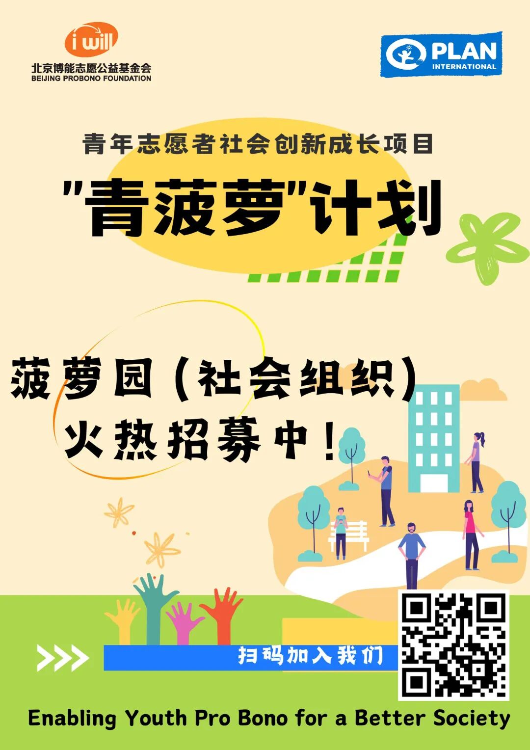 为提升社区社会组织动员青年大学生参与社区志愿服务的能力、充分发挥组织内外、社区内外支持青年群体通过志愿服务参与社会创新的潜在优势,北京博能志愿公益基金会特面向北京地区招募10家支持青年志愿者(“青菠萝”Youth Probono)社会创新成长的伙伴组织,让社区成为青菠萝社会创新的孵化器——菠萝园(Youth Probono Incubator)。