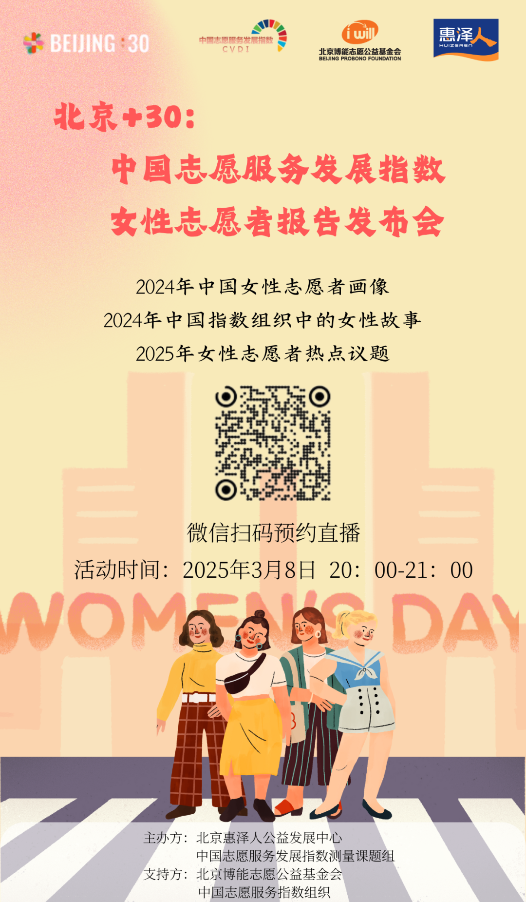 在社会的每一个角落,都有这样一群女性,她们以爱为光,照亮他人前行的道路;以奉献为笔,书写着温暖的篇章。她们就是女性志愿者,女性志愿服务为社会创造了巨大的价值,同时,志愿服务也赋权女性,成为女性参与公共服务和社会治理的重要平台。2025 年 3 月 8 日 20:00 - 21:00,北京惠泽人公益发展中心携手中国志愿服务发展指数测量课题组,将举办一场“女性志愿者”调研发现分享会,诚邀您一同走进她们的世界。