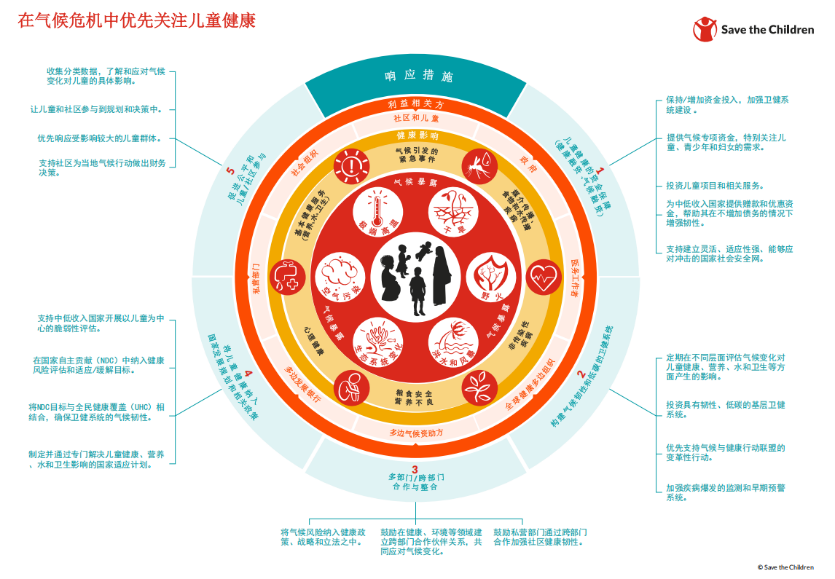 建立低碳、气候适应型健康系统,优先将健康纳入气候战略,投资儿童相关社会服务,在气候和健康相关的政策制定、项目实施以及融资过程中,确保儿童的安全和鼓励儿童有意义的参与。