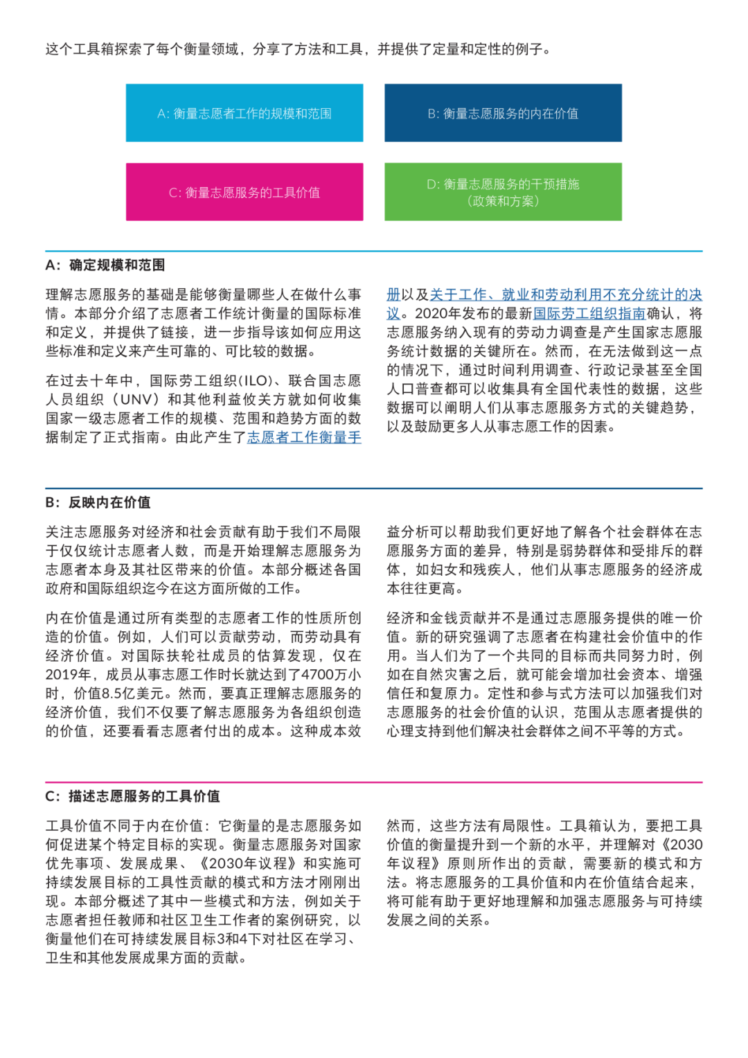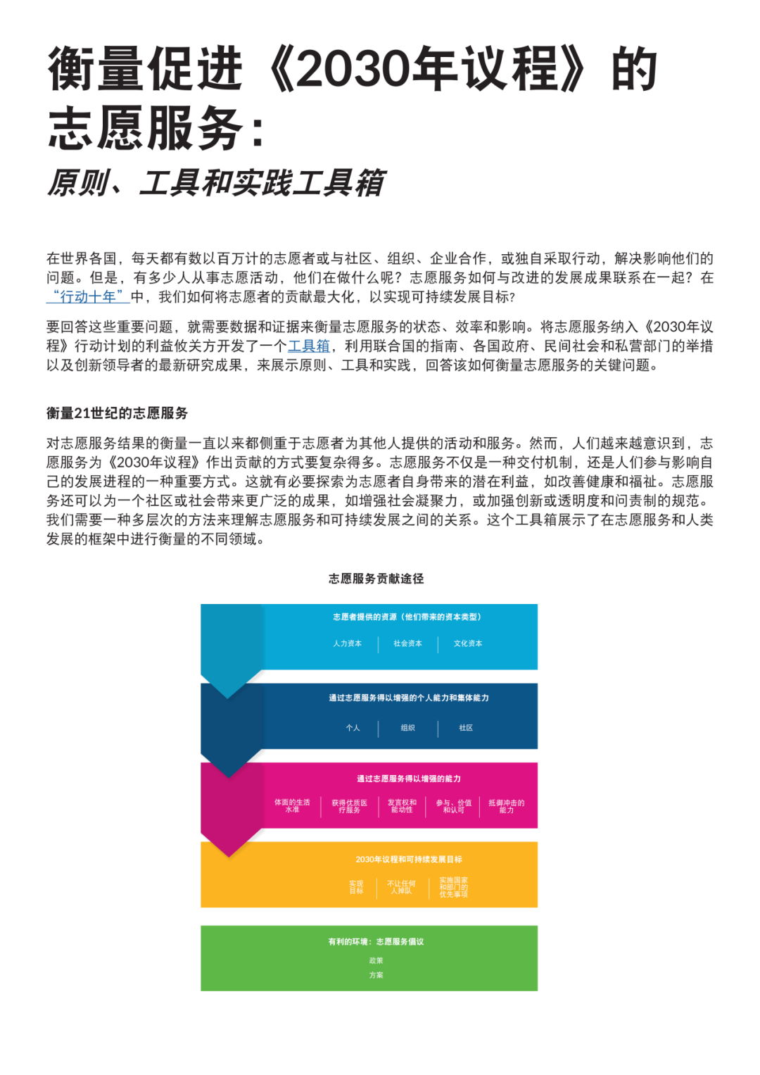 本工具箱旨在为政策制定者、民间社会组织、私营部门以及志愿者自身提供一个全面的框架,以衡量和增强志愿服务对《2030年议程》的贡献。它汇集了联合国的指南、各国政府、民间社会和私营部门的举措,以及创新领导者的最新研究成果,展示了衡量志愿服务的关键原则、工具和实践。