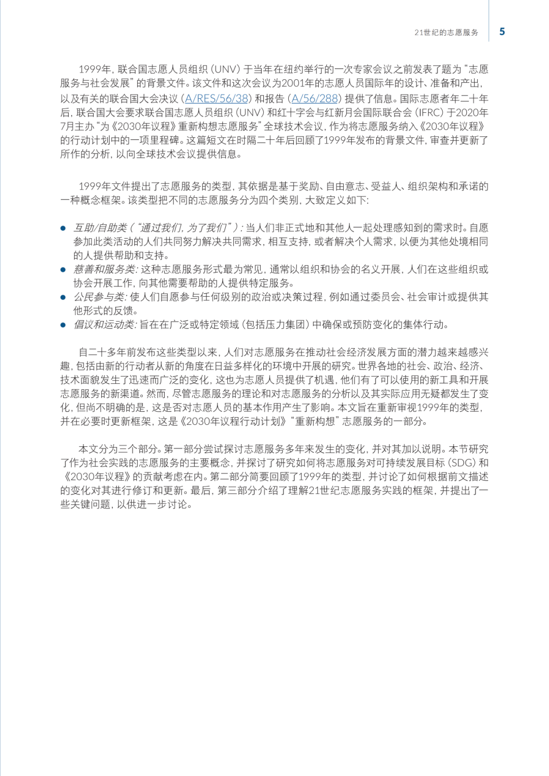 本文件分为三个部分:首先探讨志愿服务的变化及其对社会问题的影响;其次,回顾并扩展1999年的志愿服务类型;最后,介绍一个新的模型,以全面理解21世纪志愿服务的复杂性和多样性。文件强调,志愿服务是实现可持续发展目标的关键手段,能够促进社区复原力和社会包容性。