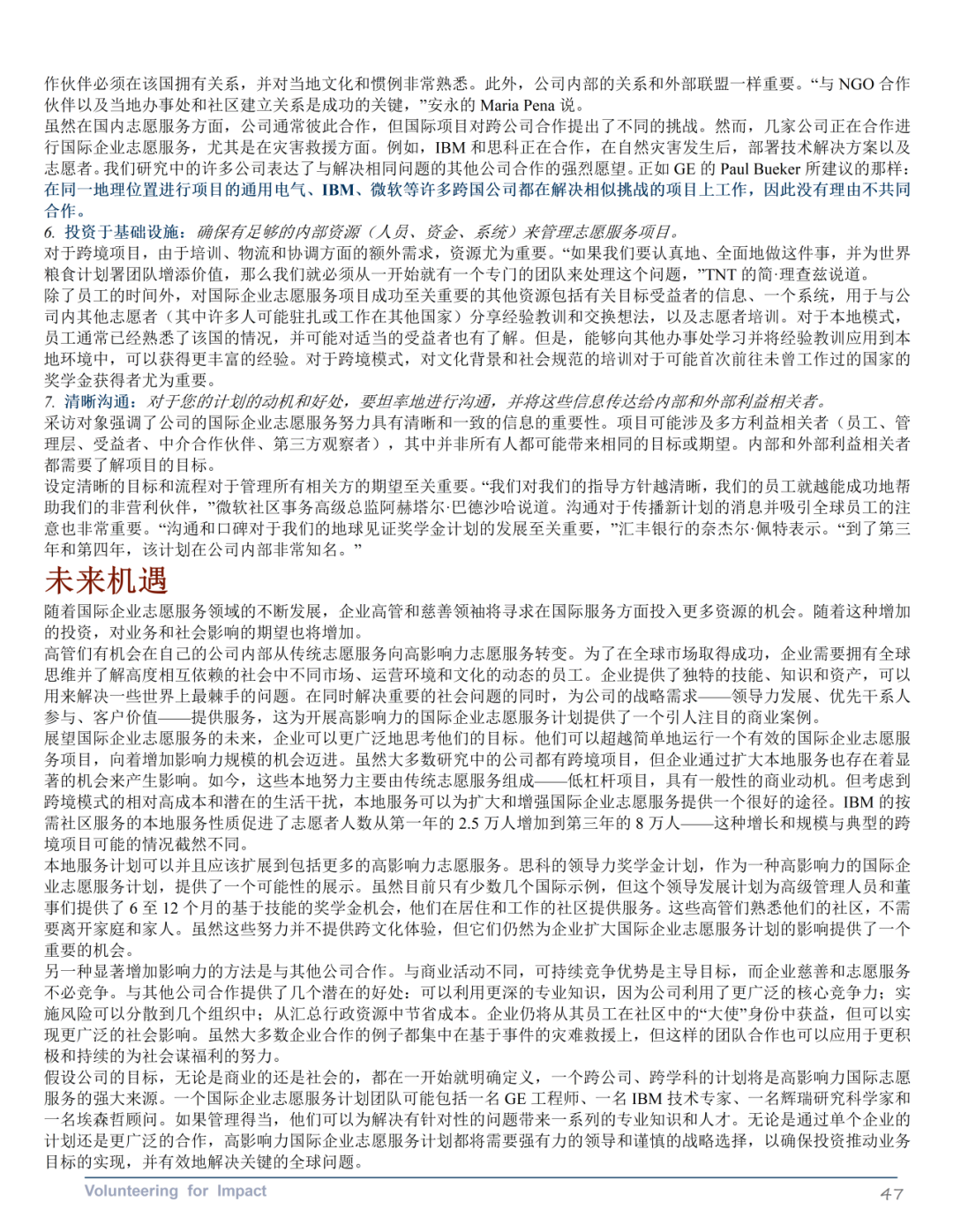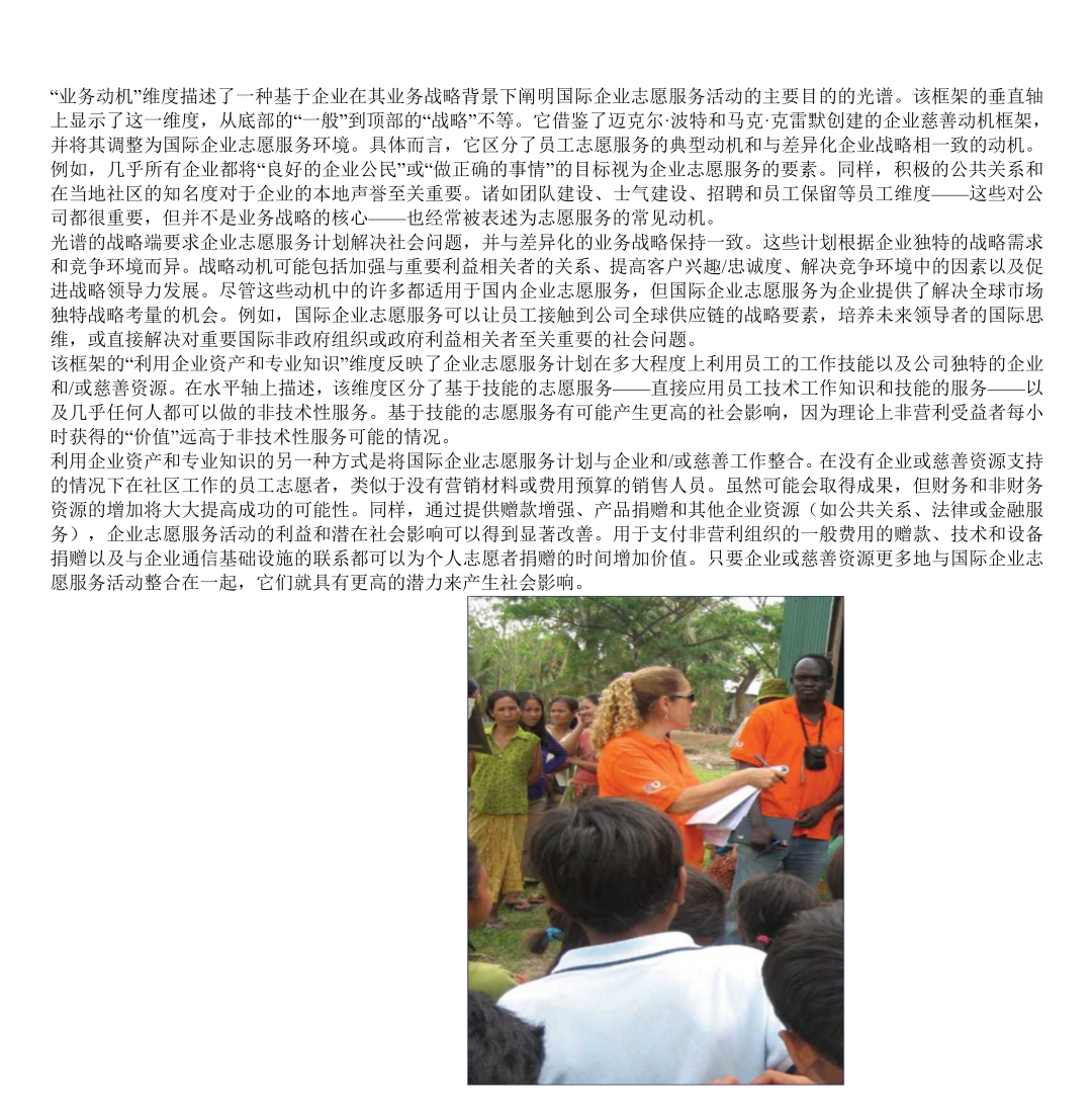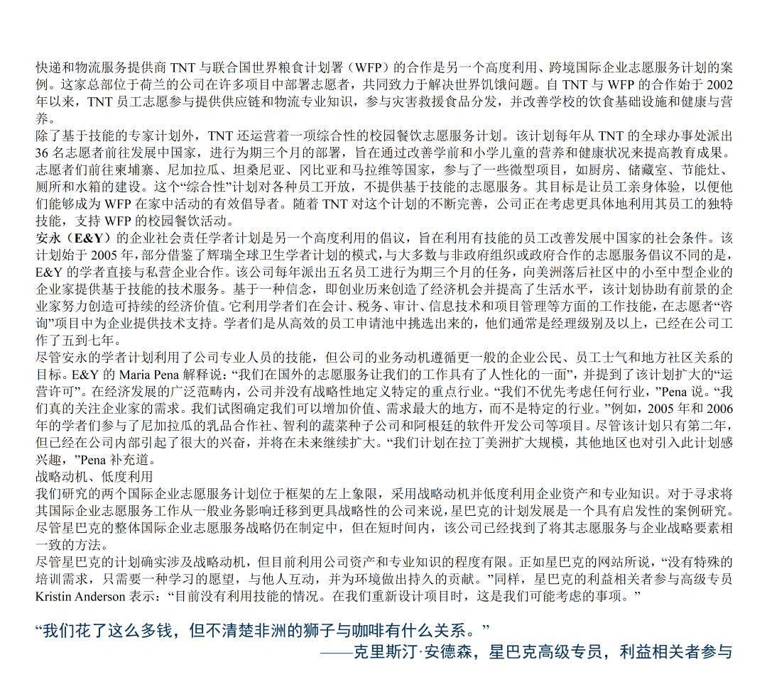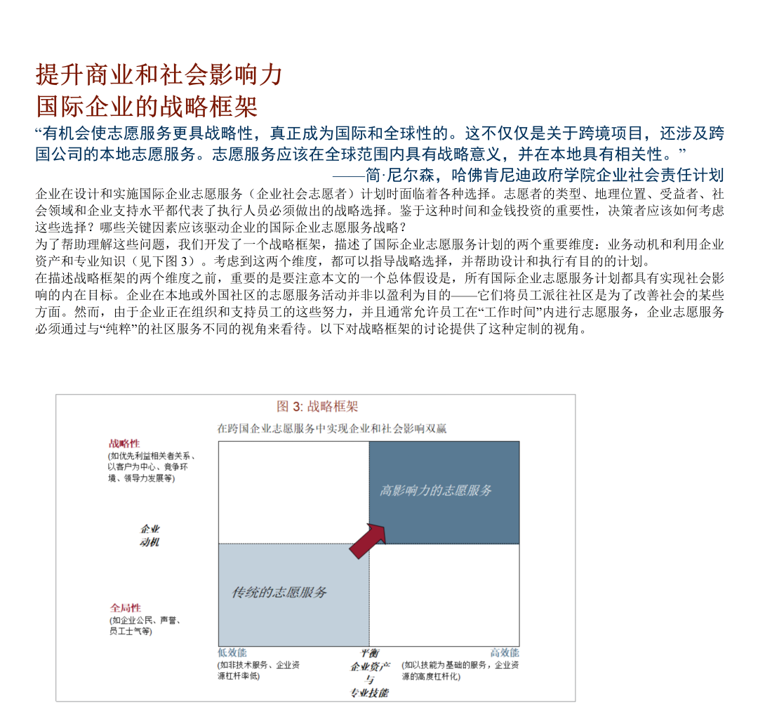 《国际企业志愿服务优秀案例》第三部分探讨了企业如何通过国际企业志愿服务计划在全球范围内提升其商业和社会影响力。该部分介绍了一个包含业务动机和利用企业资产与专业知识两个重要维度的战略框架。其中业务动机维度区分了员工志愿服务的一般动机(如企业公民、公司声誉和员工士气)和与公司战略一致的动机(如利益相关者关系、以客户为中心、竞争环境和领导力发展)。企业资产和专业知识的杠杆作用维度反映了企业志愿服务项目利用员工工作技能和公司独特的企业和慈善资源的程度。报告还提供了具体公司的案例研究,展示了框架四个象限中的每个象限的一个或几个特征,阐明了大公司如何选择部署员工以提供商业和社会影响。报告还提供了一系列最佳实践建议,包括在确定角色之前设定目标、循序渐渐、以发挥优势为先导、将慈善捐赠和企业社会责任活动保持一致、倡导合作伙伴关系、投资于基础设施和清晰沟通。最后,报告讨论了国际企业志愿服务领域的未来发展机会,包括从传统志愿服务向高影响力志愿服务的转变,以及与其他公司合作增加影响力的潜力。
