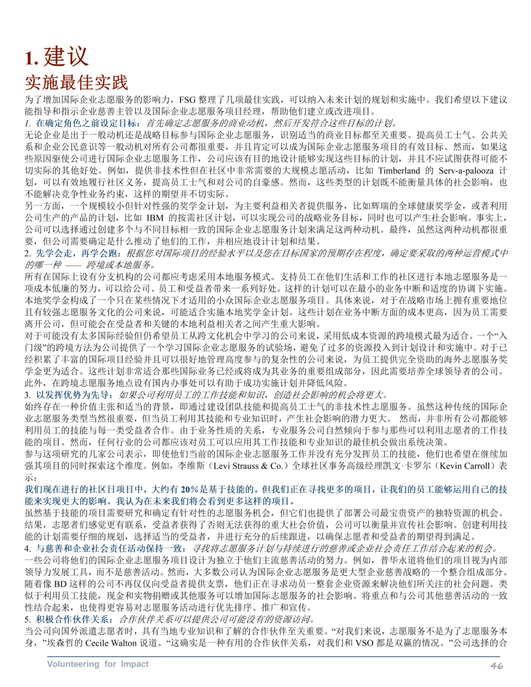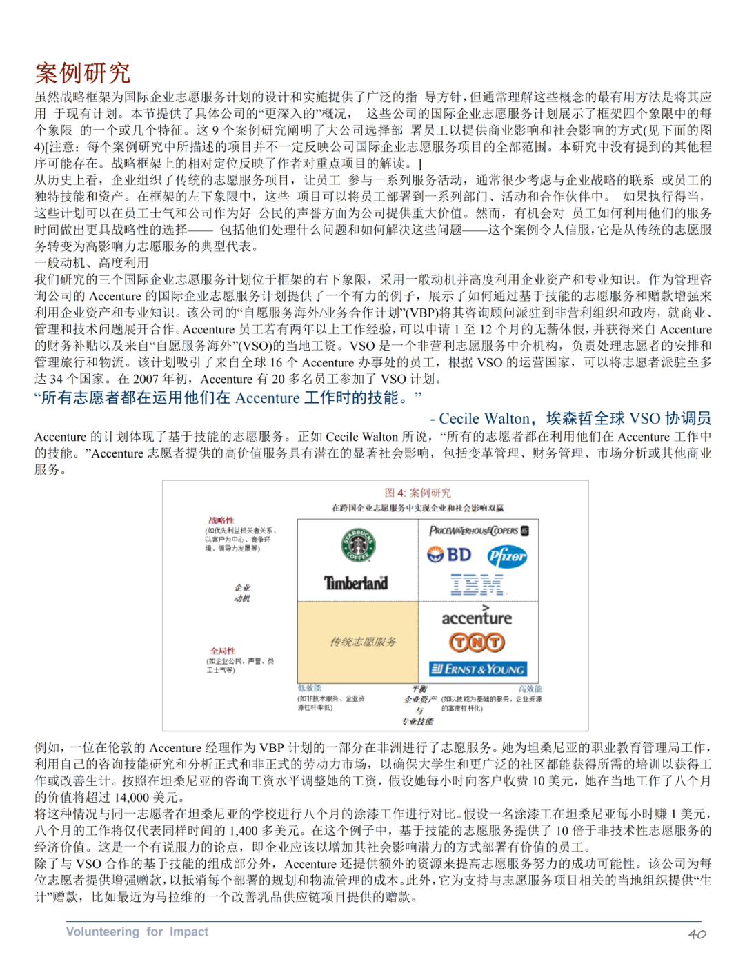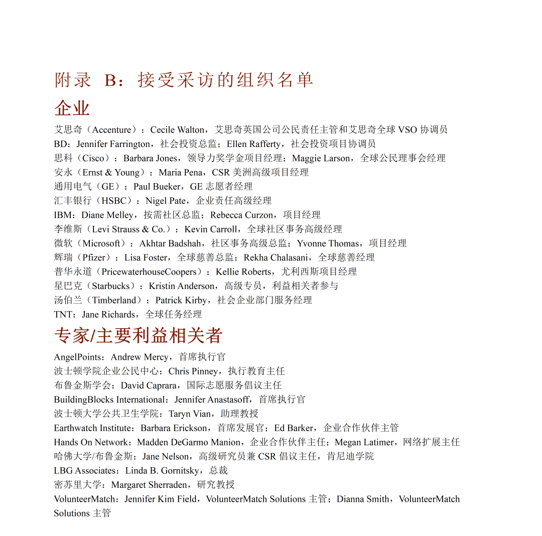 《国际企业志愿服务优秀案例》第三部分探讨了企业如何通过国际企业志愿服务计划在全球范围内提升其商业和社会影响力。该部分介绍了一个包含业务动机和利用企业资产与专业知识两个重要维度的战略框架。其中业务动机维度区分了员工志愿服务的一般动机(如企业公民、公司声誉和员工士气)和与公司战略一致的动机(如利益相关者关系、以客户为中心、竞争环境和领导力发展)。企业资产和专业知识的杠杆作用维度反映了企业志愿服务项目利用员工工作技能和公司独特的企业和慈善资源的程度。报告还提供了具体公司的案例研究,展示了框架四个象限中的每个象限的一个或几个特征,阐明了大公司如何选择部署员工以提供商业和社会影响。报告还提供了一系列最佳实践建议,包括在确定角色之前设定目标、循序渐渐、以发挥优势为先导、将慈善捐赠和企业社会责任活动保持一致、倡导合作伙伴关系、投资于基础设施和清晰沟通。最后,报告讨论了国际企业志愿服务领域的未来发展机会,包括从传统志愿服务向高影响力志愿服务的转变,以及与其他公司合作增加影响力的潜力。