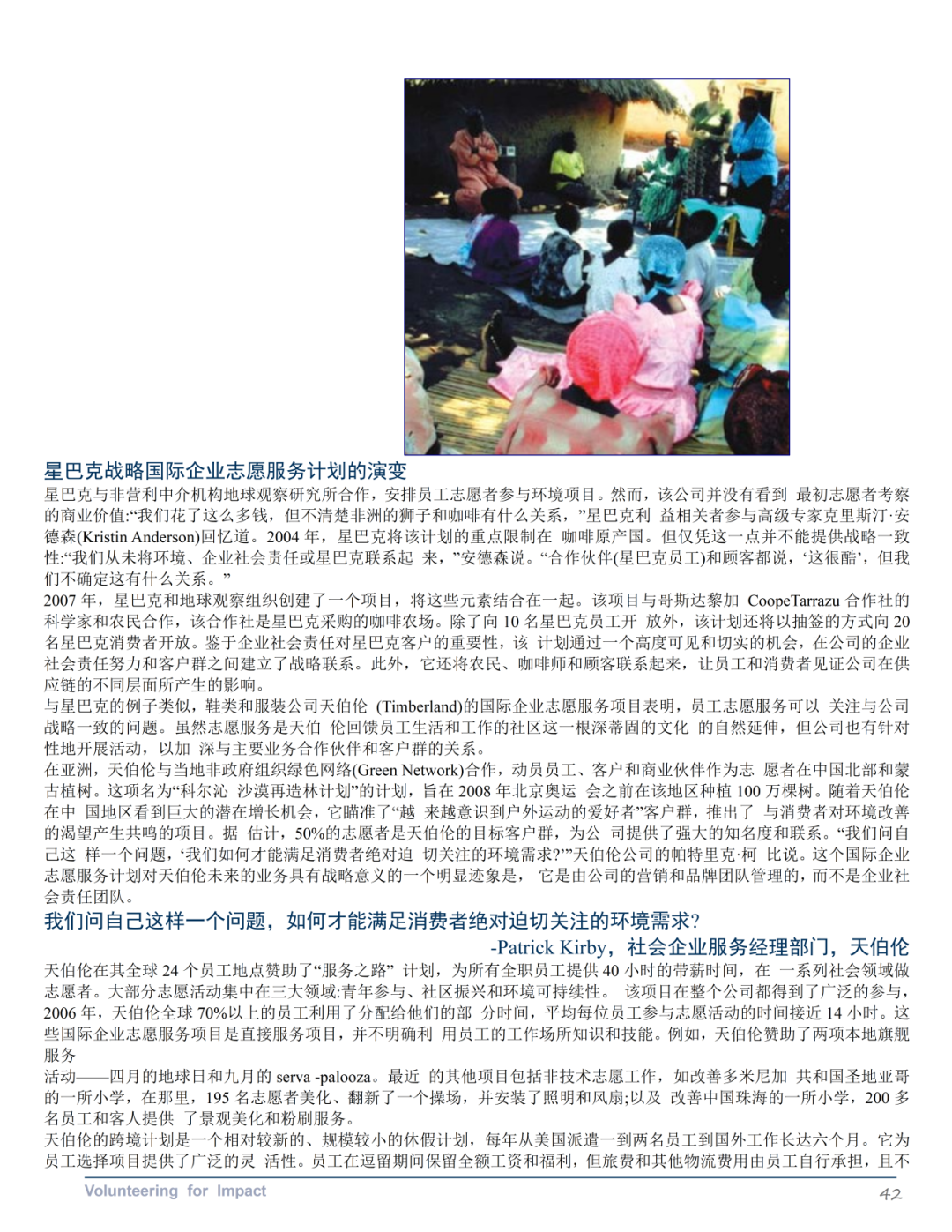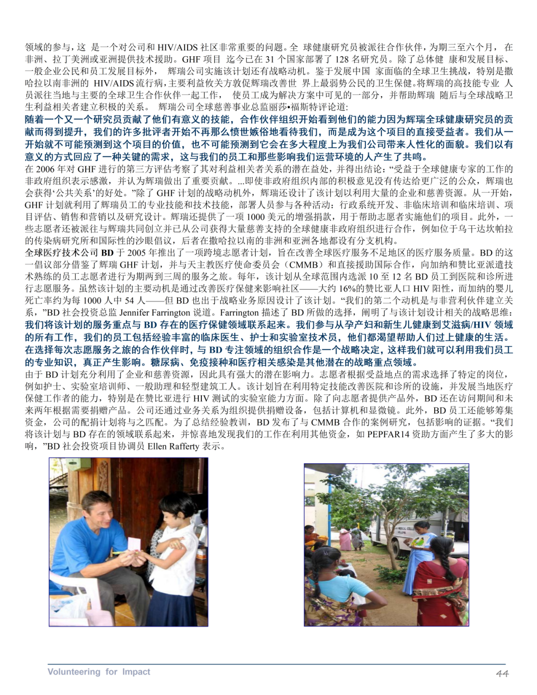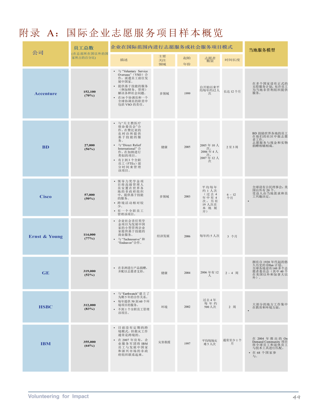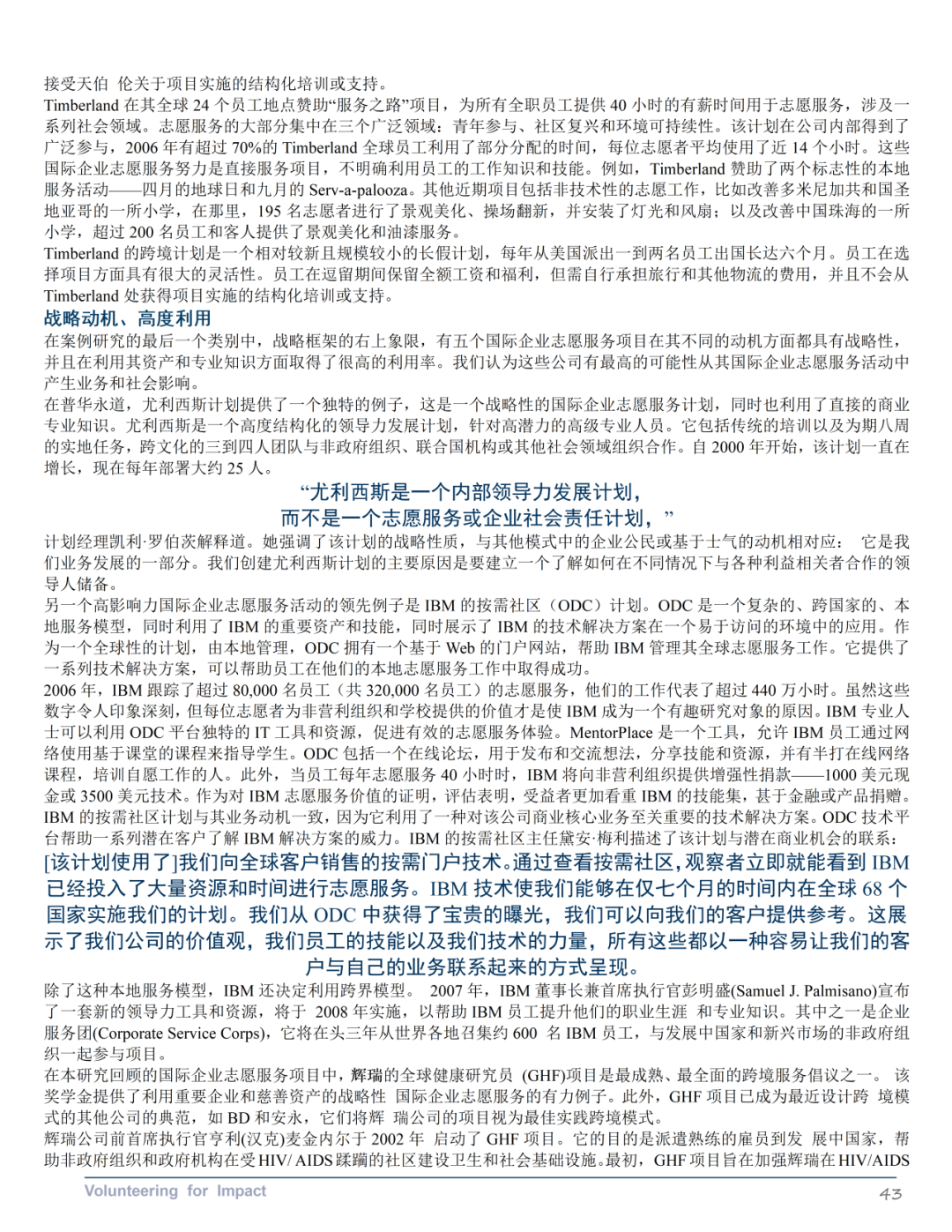 《国际企业志愿服务优秀案例》第三部分探讨了企业如何通过国际企业志愿服务计划在全球范围内提升其商业和社会影响力。该部分介绍了一个包含业务动机和利用企业资产与专业知识两个重要维度的战略框架。其中业务动机维度区分了员工志愿服务的一般动机(如企业公民、公司声誉和员工士气)和与公司战略一致的动机(如利益相关者关系、以客户为中心、竞争环境和领导力发展)。企业资产和专业知识的杠杆作用维度反映了企业志愿服务项目利用员工工作技能和公司独特的企业和慈善资源的程度。报告还提供了具体公司的案例研究,展示了框架四个象限中的每个象限的一个或几个特征,阐明了大公司如何选择部署员工以提供商业和社会影响。报告还提供了一系列最佳实践建议,包括在确定角色之前设定目标、循序渐渐、以发挥优势为先导、将慈善捐赠和企业社会责任活动保持一致、倡导合作伙伴关系、投资于基础设施和清晰沟通。最后,报告讨论了国际企业志愿服务领域的未来发展机会,包括从传统志愿服务向高影响力志愿服务的转变,以及与其他公司合作增加影响力的潜力。