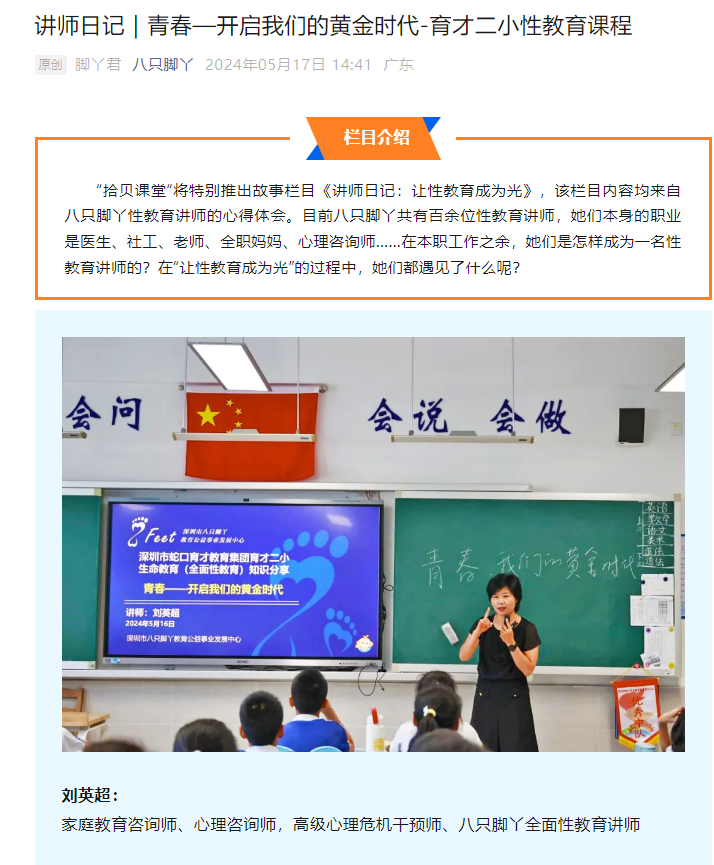 深圳市八只脚丫教育公益事业发展中心2016年5月成立,聚焦儿童福祉,以提供高质量教育资源服务助力孩子全面发展为目标,将全面性教育作为重要战略部分,关注多方面议题,预防相关问题,营造良好成长环境。