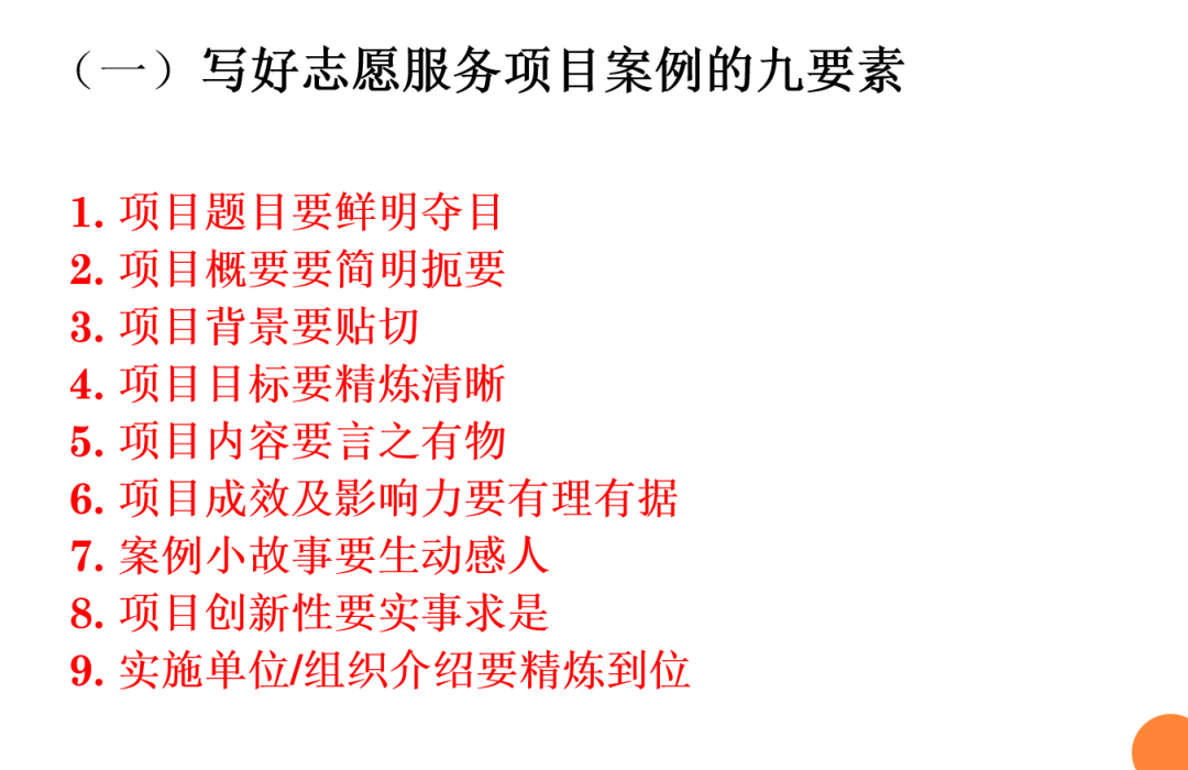 随后,王老师结合多年的学术研究经验,对如何撰写出一份优秀的志愿服务项目案例做了细致介绍。首先,她分享了志愿服务项目撰写的九要素,分别是鲜明夺目的项目题目、简明扼要的项目概要、贴切的项目背景、精炼清晰的项目目标、言之有物的项目内容、有理有据的项目成效及影响力、生动感人的案例小故事、实事求是的项目创新性、精炼到位的实施单位、组织介绍。