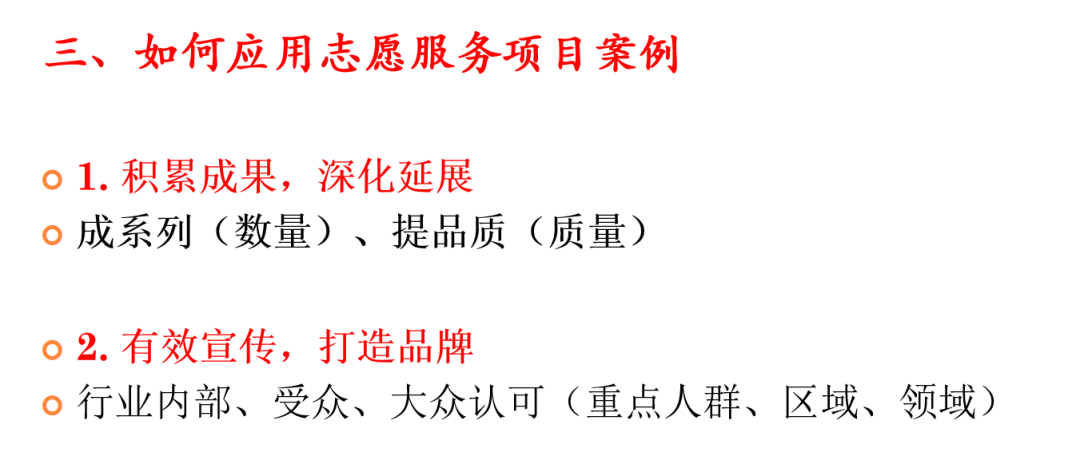 最后,王老师就案例成稿后可以应用在哪些场景也进行了分享,她指出项目案例的使用场景多元,既可以在宣传栏、印刷品、刊物等进行发布和宣传,也可以将案例制作成短视频形式进一步传播。因此,案例的撰写和应用既是一项技能,更是一种意识,让优秀的志愿服务项目案例不断沉淀和凝聚,终将会碰撞出志愿服务的智慧火花,照亮前行的志愿队伍!
